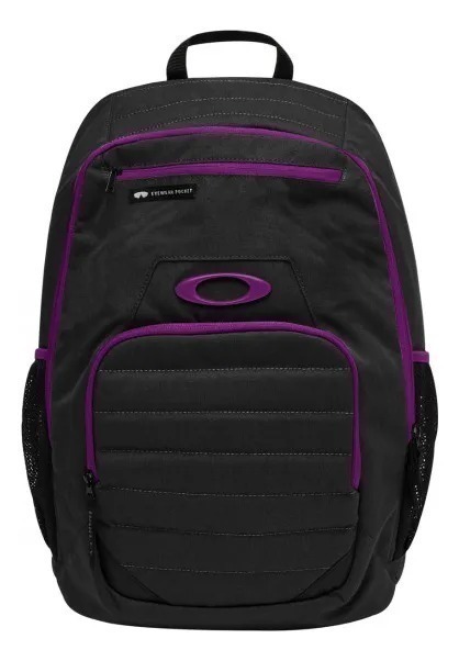 A mochila é arrematada por um bolso externo para óculos e pelo logo Oakley Elipse.