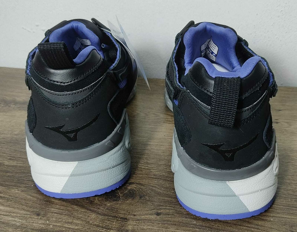 Preto e roxo predominam no tênis, mas seu grande diferencial fica em seus Runbird, o famoso logo da Mizuno aplicado nas laterais.